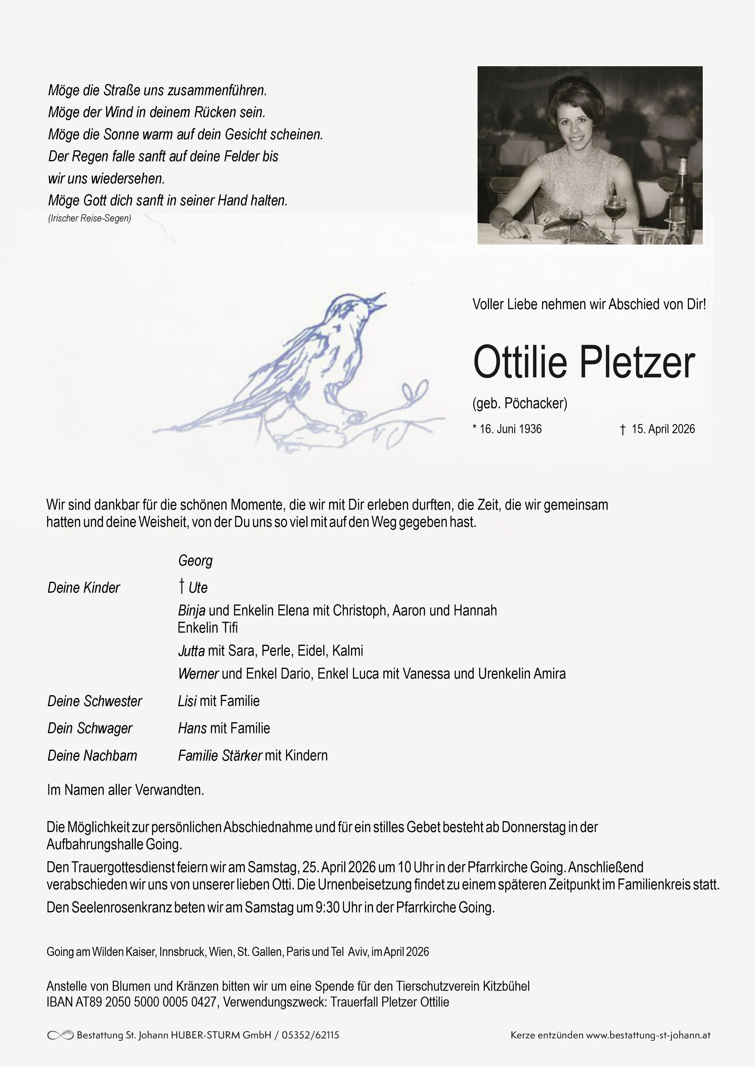 Die Möglichkeit zur persönlichen Abschiednahme sowie für ein stilles Gebet für Ottilie Pletzer besteht ab Donnerstag, 23. April 2026 in der Aufbahrungshalle Going. Wir beten den Seelenrosenkranz am Samstag, 25. April 2026 um 09:30 Uhr in der Pfarrkirche Going.