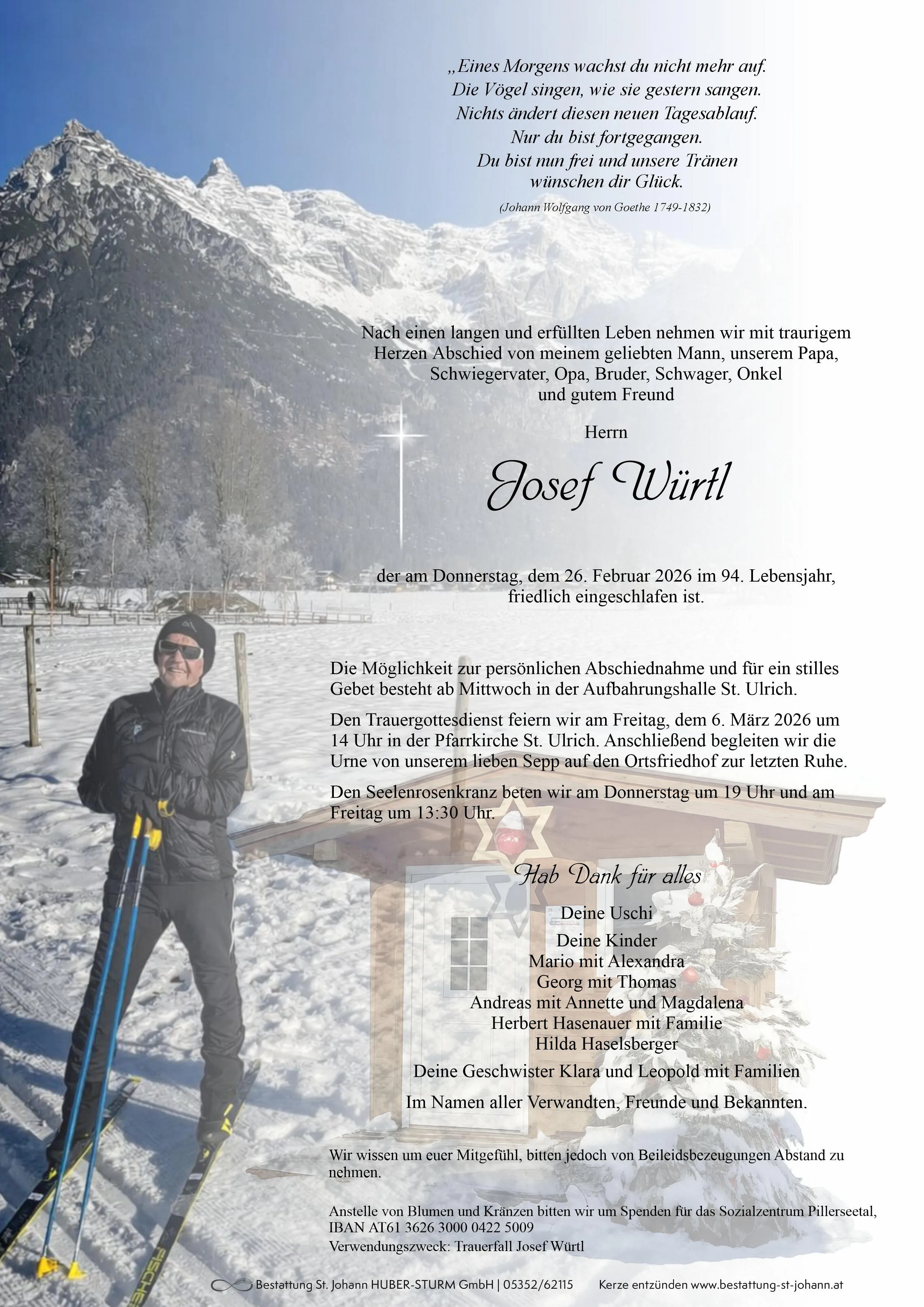 Die Möglichkeit zur persönlichen Abschiedname sowie für ein stilles Gebet für unseren lieben Josef Würtl besteht ab Mittwoch, 4. März 2026 in der Aufbahrungshalle St. Ulrich am Pillersee. Wir beten den Seelenrosenkranz am Donnerstag, 5. März 2026 um 19 Uhr in der und am Freitag, 6. März 2026 um 13:30 Uhr in der Pfarrkirche St. Ulrich am Pillersee.