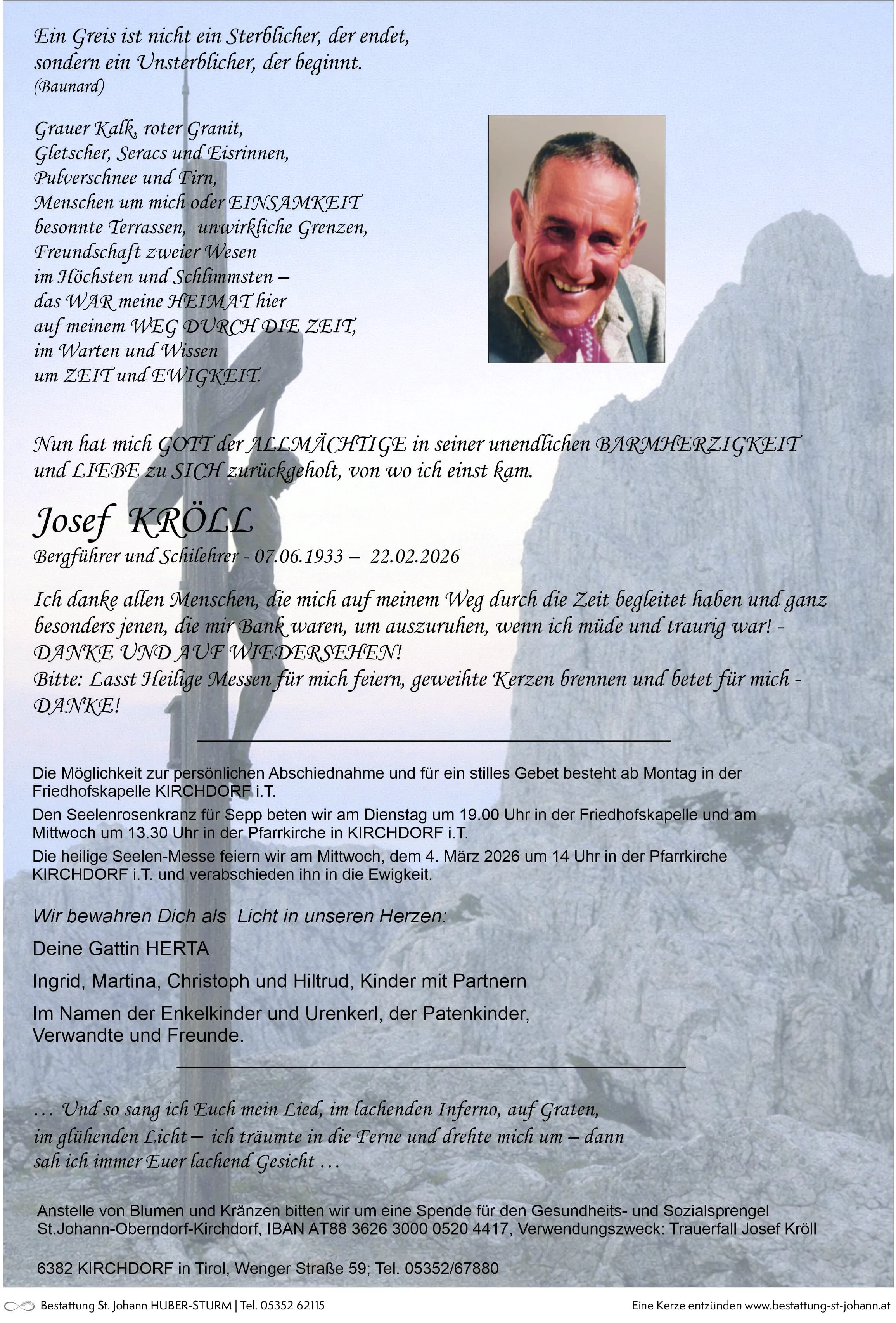 Die Möglichkeit zur persönlichen Abschiedname sowie für ein stilles Gebet für unseren lieben Josef Kröll besteht ab Montag, 2. März 2026 ab 9 Uhr in der Aufbahrungshalle Kirchdorf i.T. . Wir beten den Seelenrosenkranz am Dienstag, 3. März 2026 um 19:00 Uhr in der Aufbahrungshalle Kirchdorf in Tirol.