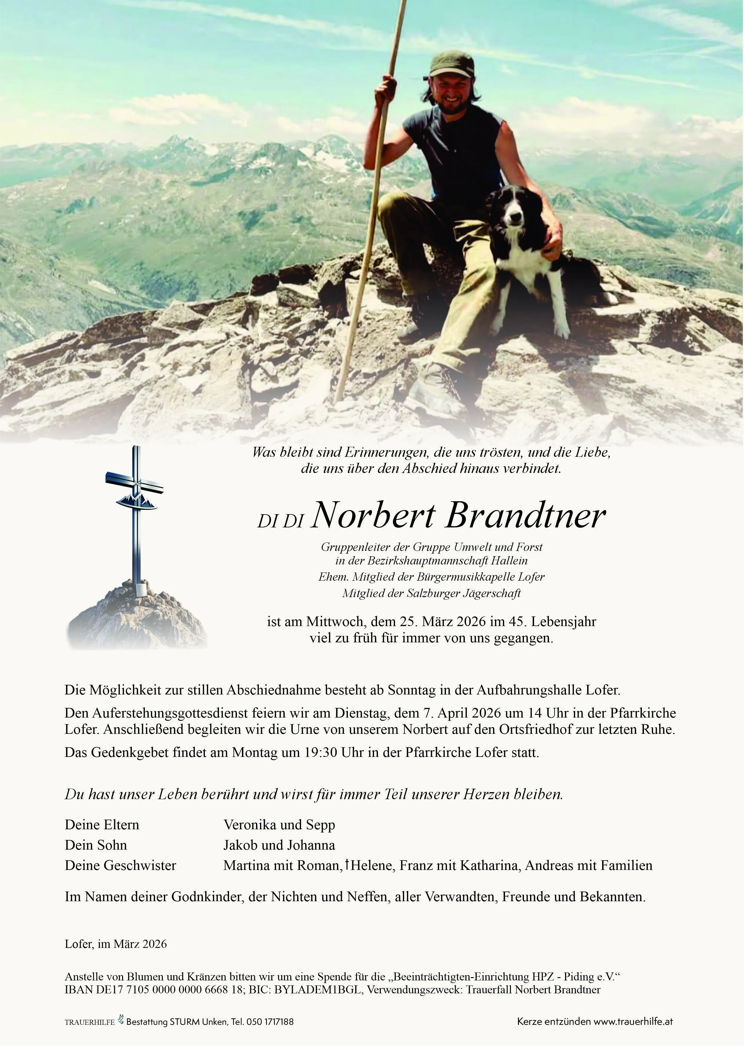 Die Möglichkeit zur persönlichen Abschiedname sowie für ein stilles Gebet für unseren lieben Norbert Brandtner besteht ab Samstag, 4. April 2026 ab 12 Uhr in der Aufbahrungshalle Lofer. Wir beten den Seelenrosenkranz am Montag, 6. April 2026 um 19:30 Uhr in der Pfarrkirche Lofer.