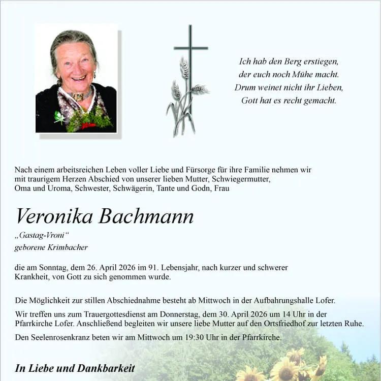 Die Möglichkeit zur persönlichen Abschiednahme sowie für ein stilles Gebet für Veronika Bachmann besteht ab Mittwoch, 29. April 2026 in der Aufbahrungshalle Lofer. Wir beten den Seelenrosenkranz am Mittwoch, 29. April 2026 um 19:30 Uhr in der Pfarrkirche Lofer.