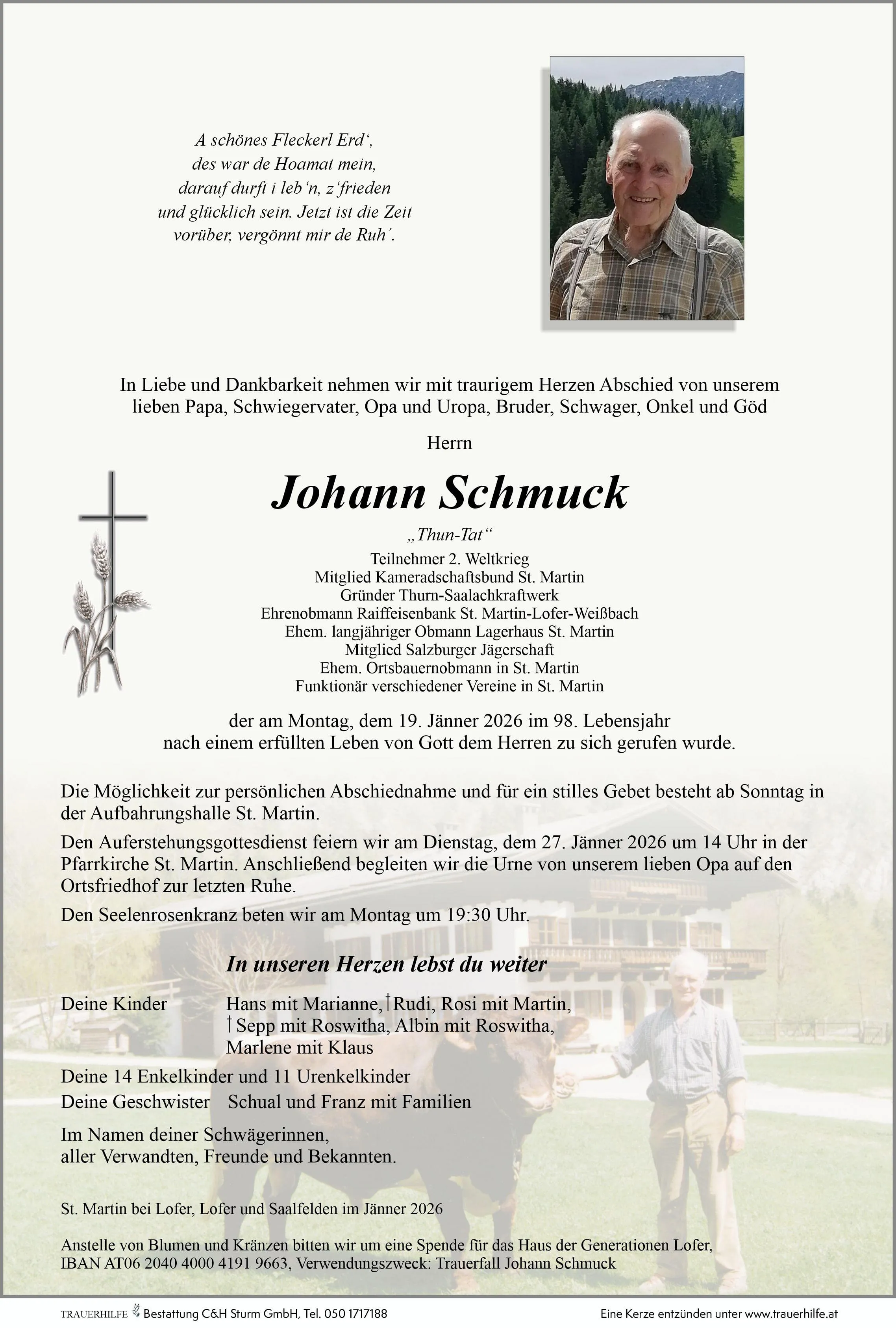 Die Möglichkeit zur persönlichen Abschiedname sowie für ein stilles Gebet für unseren lieben Johann Schmuck besteht ab Samstag, 24. Januar 2026 ab 18 Uhr in der Aufbahrungshalle St. Martin bei Lofer. Wir beten den Seelenrosenkranz am Montag, 26. Januar 2026 um 19:30 Uhr in der Aufbahrungshalle St. Martin bei Lofer.