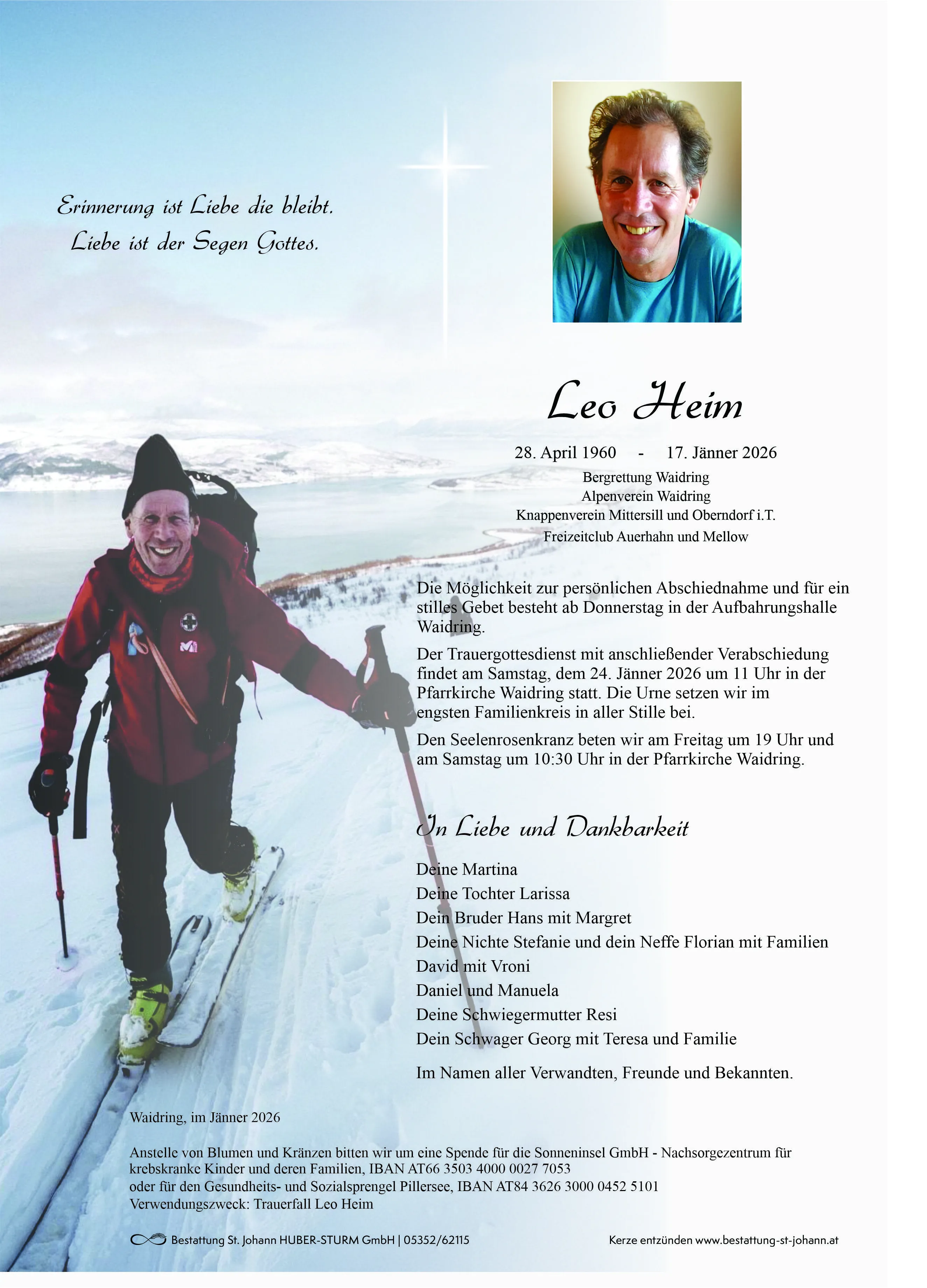 Die Möglichkeit zur persönlichen Abschiedname sowie für ein stilles Gebet für unseren lieben Leo Heim besteht ab Donnerstag, 22. Januar 2026 ab 8:00 Uhr in der Aufbahrungshalle Waidring. Wir beten den Seelenrosenkranz am Freitag, 23. Januar 2026 um 19:00 Uhr in der Pfarrkirche Waidring.