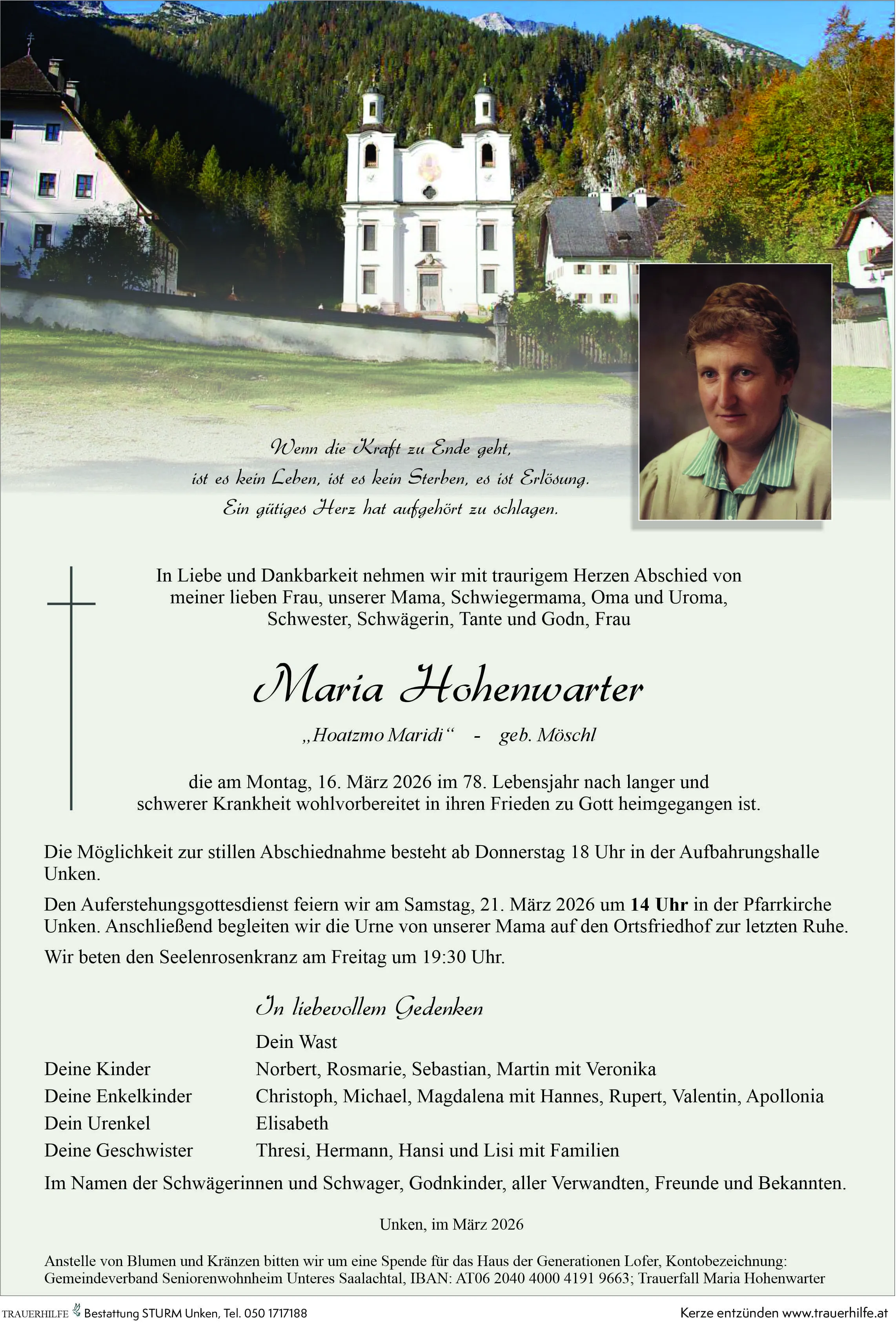 Die Möglichkeit zur persönlichen Abschiedname sowie für ein stilles Gebet für unsere liebe Maria Hohenwarter besteht ab Donnerstag, 19. März 2026 ab 18 Uhr in der Unken. Wir beten den Seelenrosenkranz am Freitag, 20. März 2026 um 19:30 Uhr in der Pfarrkirche Unken.