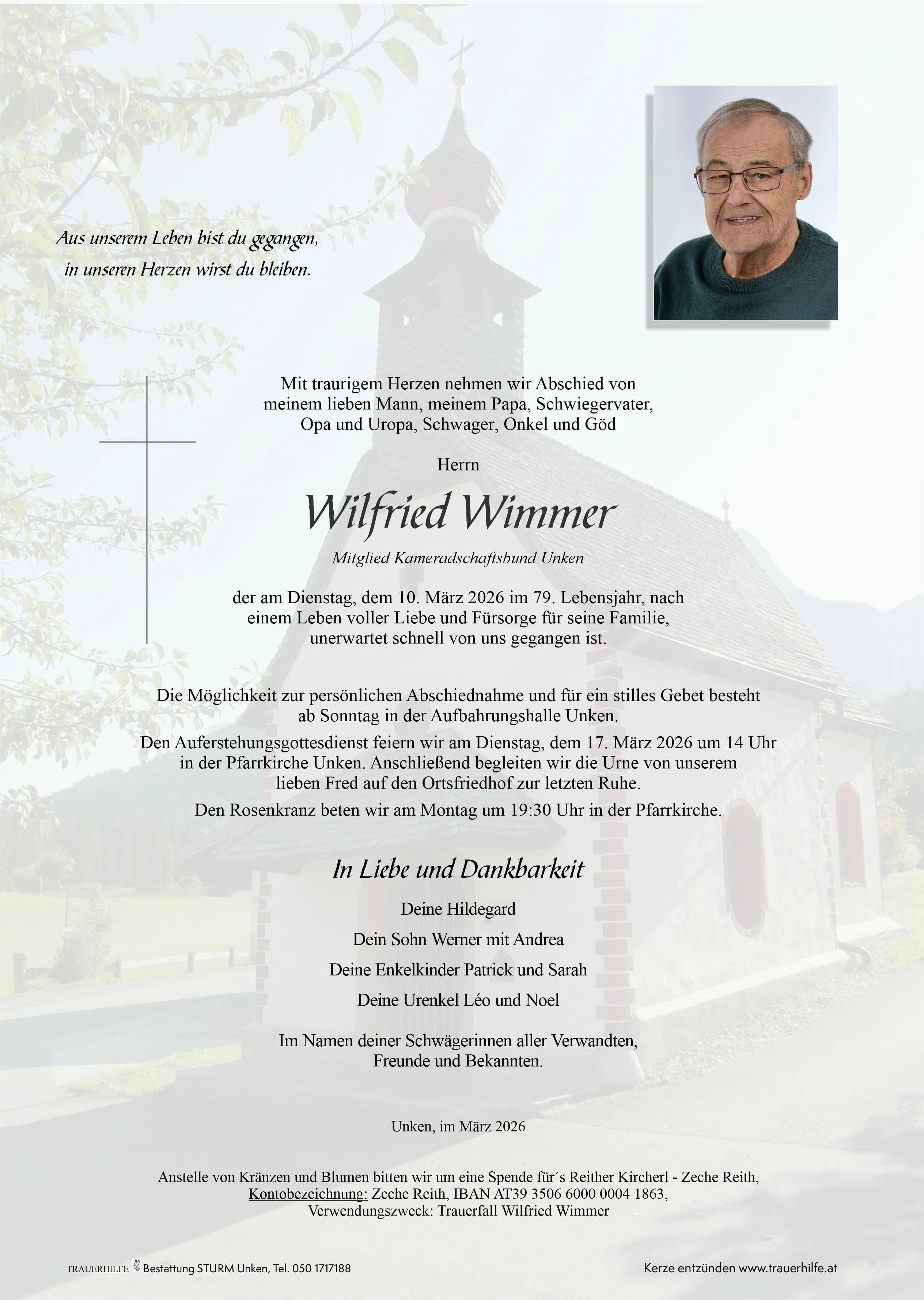 Die Möglichkeit zur persönlichen Abschiedname sowie für ein stilles Gebet für unseren lieben Wilfried Wimmer besteht ab Sonntag, 15. März 2026 in der Aufbahrungshalle Unken. Wir beten den Seelenrosenkranz am Montag, 16. März 2026 um 19:30 Uhr in der Pfarrkirche Unken.