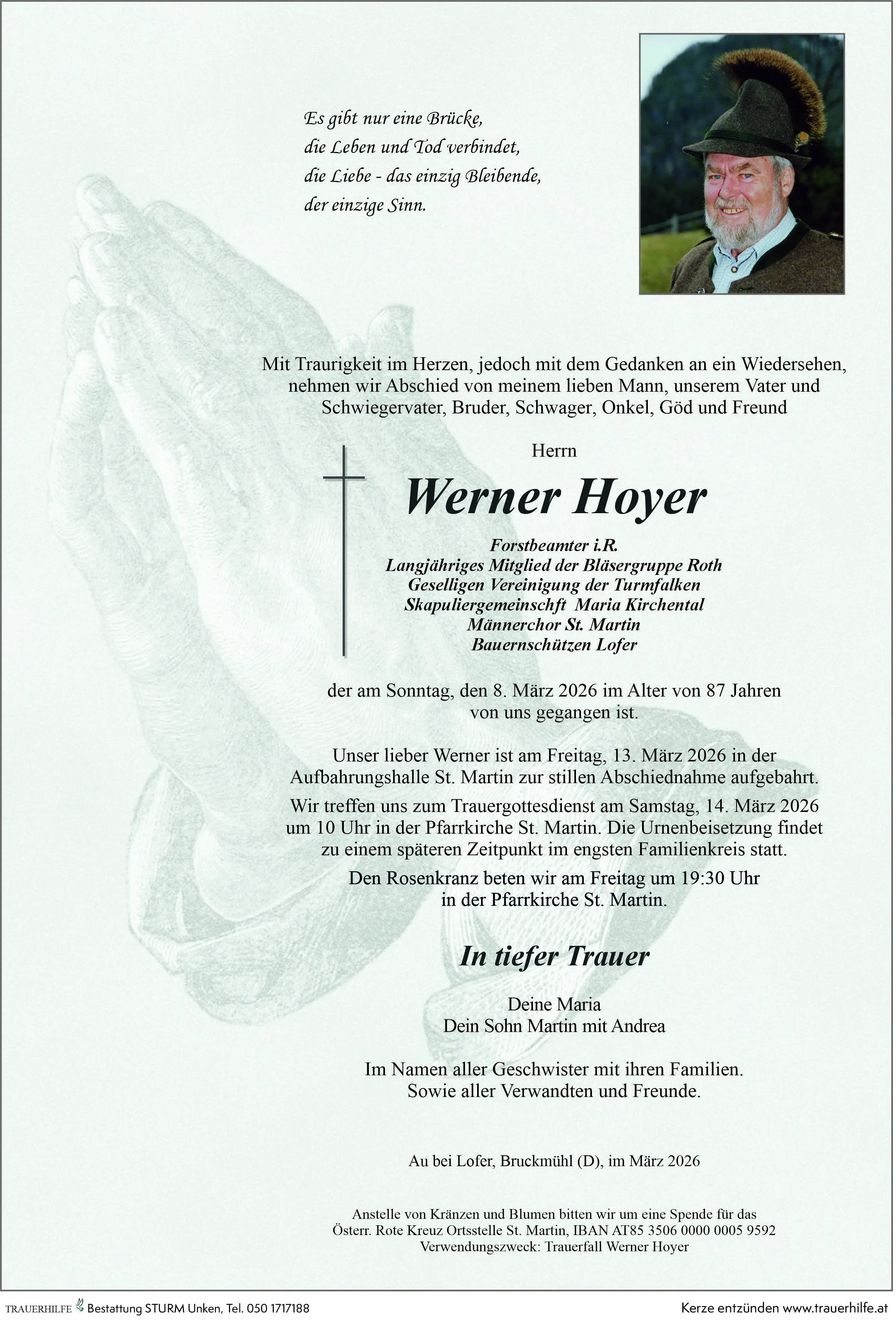 Die Möglichkeit zur persönlichen Abschiedname sowie für ein stilles Gebet für unseren lieben Werner Hoyer besteht ab Donnerstag, 12. März 2026 ab 18 Uhr in der Aufbahrungshalle St. Martin bei Lofer. Wir beten den Seelenrosenkranz am Freitag, 13. März 2026 um 19:30 Uhr in der .